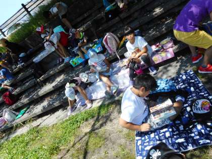 天候に恵まれ、昼食は瀬戸川の河川敷でお弁当を食べました。食後には早速、図書館で借りた本を読む姿が見られました。