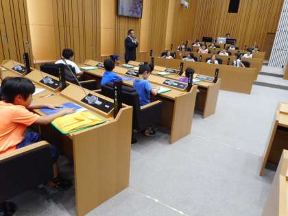 市役所庁舎では、市長室や議場を見学しました。議場では、議員さんの座席に座り議決の体験もさせていただき、興奮しながら見学していました。