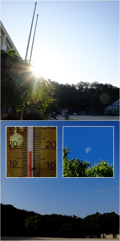 さわやかな朝です。こんな日は日中暑くなります。今日も西の空に欠け始めて月がみえました。