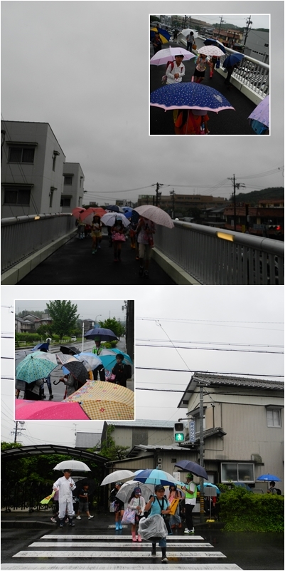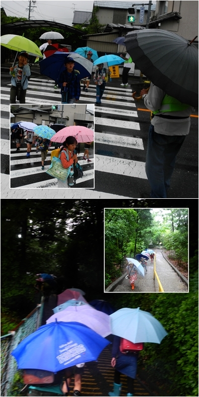 雨の中,明日から野外活動の事前準備のため5年生が大きな荷物を持ってきています。