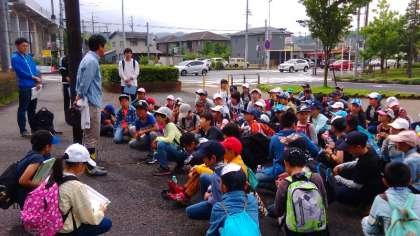 76人全員そろって、無事に出発式を迎えられました! 雨も上がり、日差しも差し込んできました。全員がスローガンの「スマイルキャンプ」を楽しめるように、力を合わせて頑張って行ってきます!