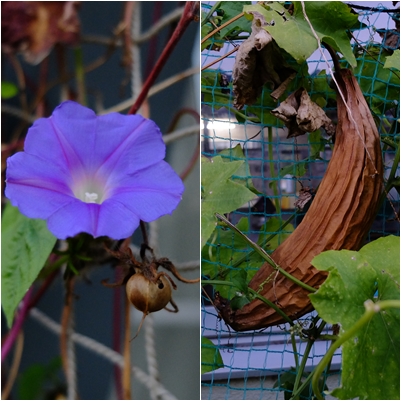 秋が深まる中,花壇の朝顔ががんばって花を咲かせています。糸瓜の大きな実が種を落とす姿になってきました。
