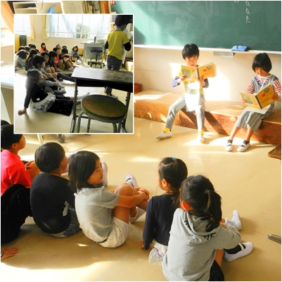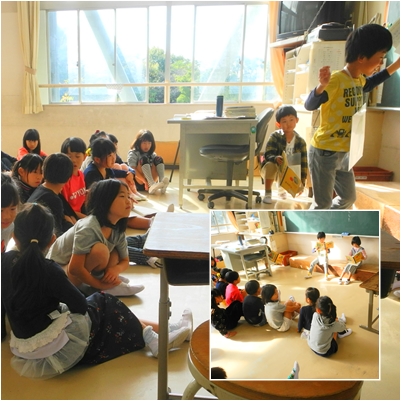 ものがたり「かえるくんとがまくん」のまとめの授業です。動作を交え音読発表をしました。