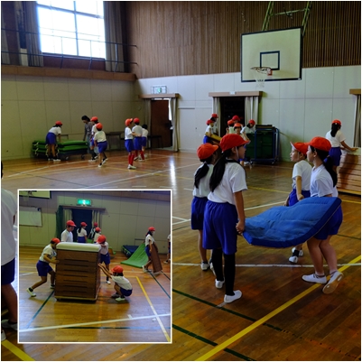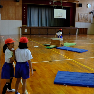マットと跳び箱の配置に着目です。十字に配置して縦・横順に跳べます。