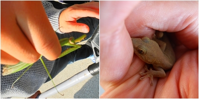 自分の持ち場で掃除をがんばっている子が多いです。途中にカマキリやヤモリがあらわれました。荒神ぼうき(小さなほうき)を正しく立てて使える子がいました。