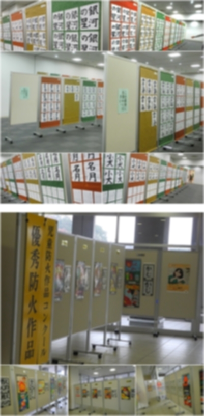 ロビーには,陶芸作品↑が展示されています。4Fには,絵画作品↑, 書写作品↓ 加えて防火作品コンクールの習字と絵画の作品↓も展示されています。