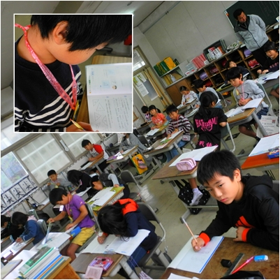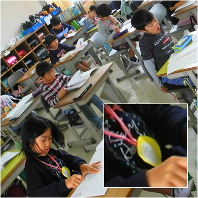 先日,姿勢についての保健の授業をうけました。授業中,体が前に傾いて姿勢が悪くなるとメダルもだらりと垂れてしまいます。「ぐー ぴた ぴん」のよい姿勢で授業をうけられるよことをめざしています。