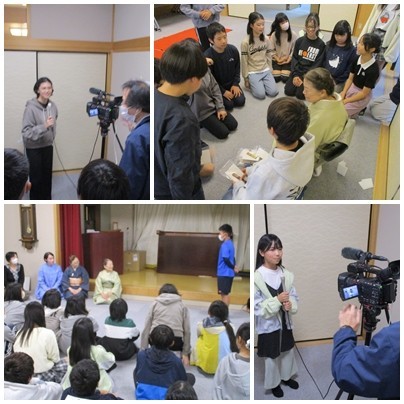 はじめに、山口八幡社のお水で手を清めました。憩の家に戻って、床の間のお軸を拝見。和室に入るときのお辞儀も勉強しました。その後、毛氈を敷いた部屋で和菓子とお抹茶をいただきました。長時間正座したので、足はびりびりしびれました。この日は、ケーブルテレビの取材があり、児童3名がインタビューを受けました。