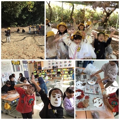 山口八幡社に出かけて、「秋見つけ」しました。きれいに色づいた葉っぱやドングリを集めてきて、教室でお面作り。味のあるお面ができました!