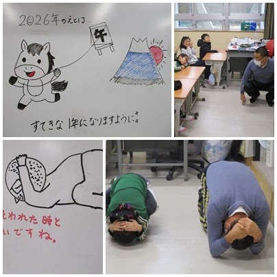 シェイクアウトとは、地震が起きたときに体を低くして頭部を守る態勢を取る訓練です。9月1日の県下一斉シェイクアウト訓練でも実施しています。3学期の避難訓練は日時を児童には知らせずに行います。その事前指導としてシェイクアウト訓練をしました。日時を子どもたちには知らせていませんが、保護者の皆様は調べれば分かってしまいます。ご協力をお願い申し上げます。