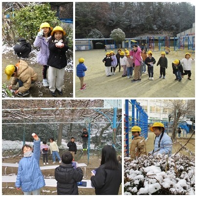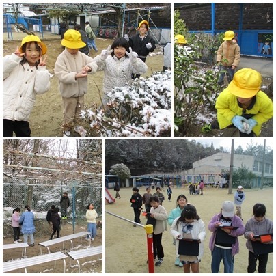 今朝は、うっすらと雪化粧。生け垣の上や遊具には、結構積もっていました。1時間目、1年生と2年生が「冬を探しに」運動場に出ていました。今朝は、登校途中も雪だるまを作りながら歩く子がたくさんいました。ひと様の家の敷地の中や自動車の雪を取らないように、朝、放送で注意喚起しました。ご迷惑をおかけしてしまった近隣の方があったかもしれません。申し訳ありませんでした。