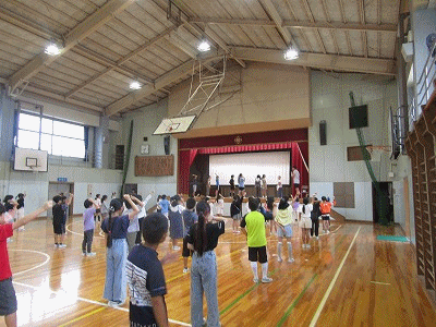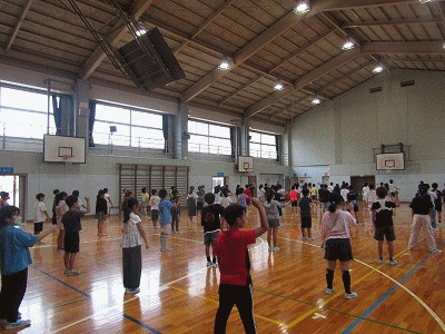体育館では、5年生が運動会の練習をしていました。手の動き方を確認しながら練習していました。