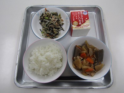 今日の献立は、ごはん、牛乳、関東煮、ひじきと春雨のごまあえです。