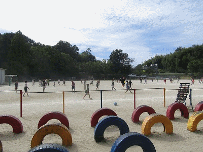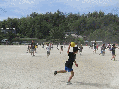 休み時間の様子です。運動場では、青空の下、子どもたちが元気よく遊んでいました。