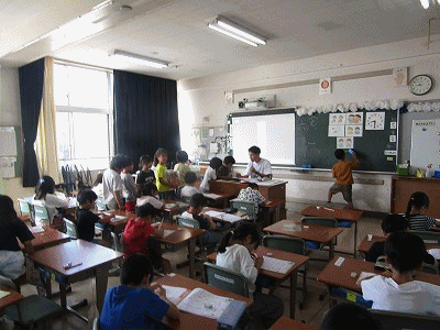 1年1組は、図工の授業でした。画用紙に形をかいて、色をつけていました。1年2組は、国語の授業でした。漢字ドリルに取り組み、先生に見せていました。1年3組は、国語の授業でした。新出漢字を習っていました。