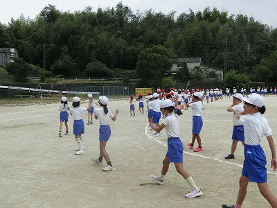 3年生・4年生は、運動場で、合同体育の授業でした。運動会の練習をしていました。隊形移動をして、ダンスの練習をしていました。