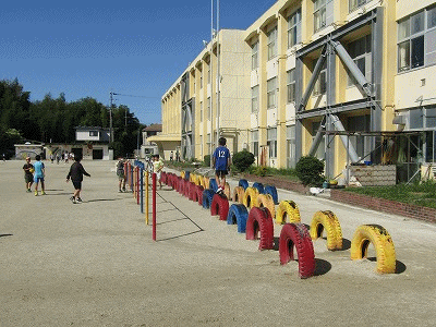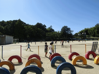 休み時間の様子です。運動場では、雲一つない青空の下、子どもたちは、元気よく遊んでいました。