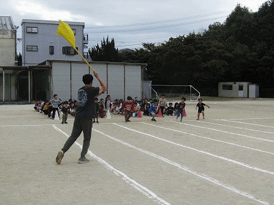 運動場では、1・2年生が合同で、運動会の練習をしていました。かけっこの練習をしていました。みんな一生懸命に走っていました。