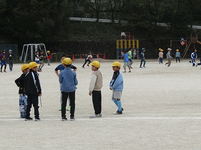休み時間の様子です。運動場では、曇り空ですが、子どもたちが元気よく遊んでいました。