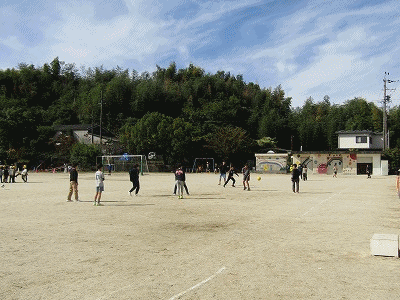 休み時間の様子です。運動場では、青空の下、子どもたちが元気よく遊んでいました。