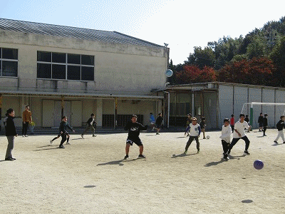 休み時間の様子です。運動場では、青空の下、子どもたちが元気よく遊んでいました。