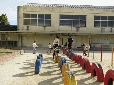 休み時間の様子です。運動所では、青空の下、子どもたちが元気よく遊んでいました。