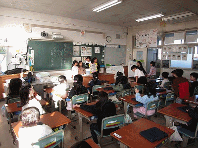 1年生の教室からです。朝の会が行われていました。先生からの連絡、3年生からのイベント紹介、健康観察などが行われていました。