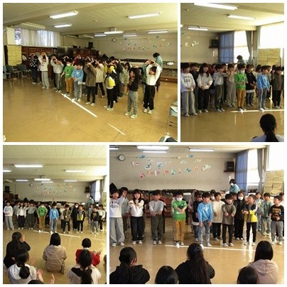 音楽室では、1年3組と6年3組が合同で音楽発表会をしていました。6年生は、合奏、1年生は振り付けをしながら歌を歌っていました。