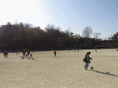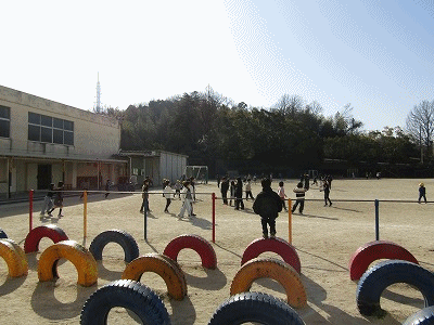 休み時間の様子です。運動場では、青空の下、子どもたちが元気よく遊んでいました。