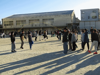 運動場では、クラスごとに、なわとび練習を行っていました。大縄で、八の字跳びをしています。どのクラスも日に日に上達してきました。