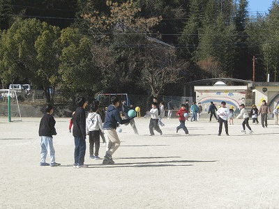休み時間の様子です。風は冷たいですが、運動場では、青空の下、子どもたちが元気よく遊んでいました。