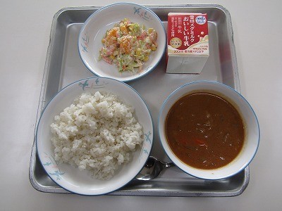 今日の献立は、麦ごはん、牛乳、ハヤシシチュー、みかんのコールスローサラダです。