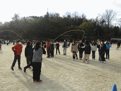 運動場では、クラスごとに大縄跳びの練習をしました。八の字跳びで、どのクラスも上手に跳べるようになってきました。