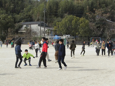 休み時間の様子です。運動場では、青空の下、子どもたちが元気よく遊んでいました。