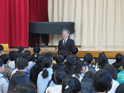 体育館では、全校児童が集まり、朝礼が行われました。はじめに、校長先生のお話を聞きました。その後、二人の先生からのお話を聞きました。