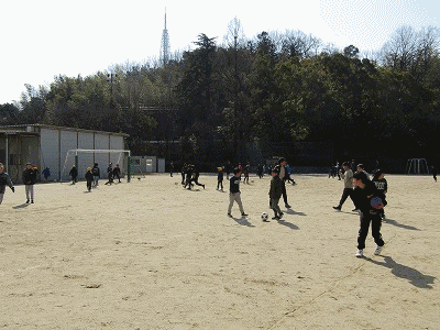 休み時間の様子です。運動場では、青空の下、子どもたちが元気よく遊んでいました。