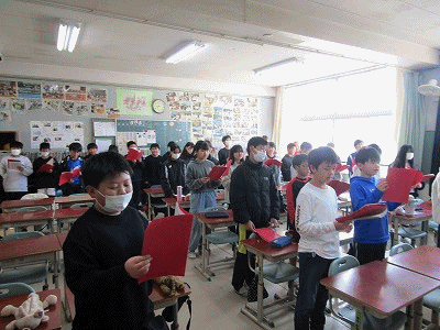 6年生の教室からです。美しい歌声が聞こえてきました。卒業式に向けて、歌の練習をしていました。