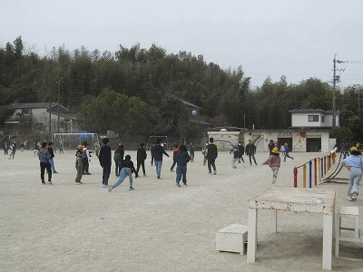 休み時間の様子です。曇り空ですが、運動場では、子どもたちが元気よく遊んでいました。