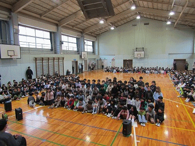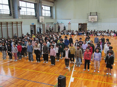 体育館では、全校児童が集まり、ありがとうの会が行われました。学年ごとに歌やダンス、劇などの発表がありました。最後に全校で歌を歌いました。
