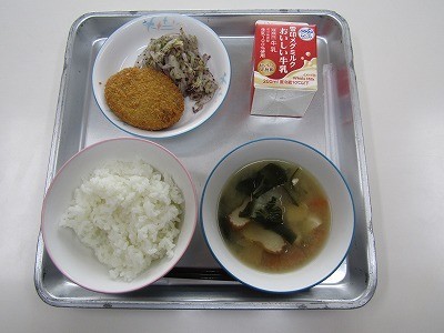 今日の献立は、ごはん、牛乳、はんぺんのみそ汁、コロッケ、赤じそあえです。
