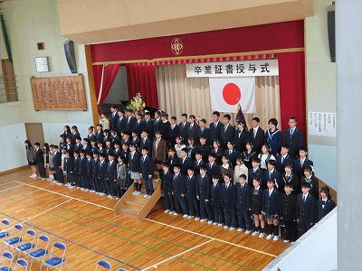 体育館では、卒業証書授与式が行われました。多くのご来賓、保護者、在校生に見守られ堂々とした態度で式に臨んでいました。美しい歌声も聞かれました。卒業おめでとうございます。