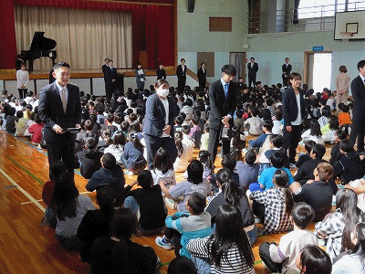 体育館には、全校児童が集まり、始業式が行われました。はじめに、新しく転任された教職員の紹介がありました。その後、校長先生のお話、担任発表がありました。最後に、みんなで校歌を歌いました。