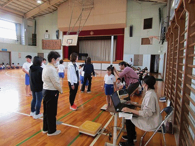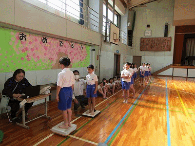 体育館では、身体計測が行われました。身長と体重を測りました。みんな大きくなりました。