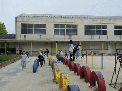 休み時間の様子です。今にも雨が降りだしそうな天気ですが、運動場では、子どもたちが元気よく遊んでいました。
