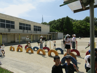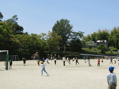 休み時間の様子です。運動場では、青空の下、子どもたちが元気よく遊んでいました。1年生も、外遊びが始まりました。