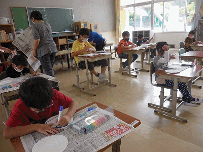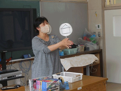 「クルクルアットホーム」……くるくる回して、家に動物?がいるような工作をしました。屋根に色を塗り、お気に入りの動物を描いて裏表に張り付け、くるくる回して楽しみます。