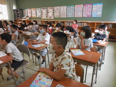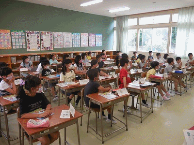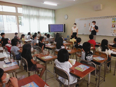 ジェレット先生の授業です。「How are you?」に対するいろいろな答え方を覚えます。3限目なのに、もう「I'm hungry.」の子がいるかな?