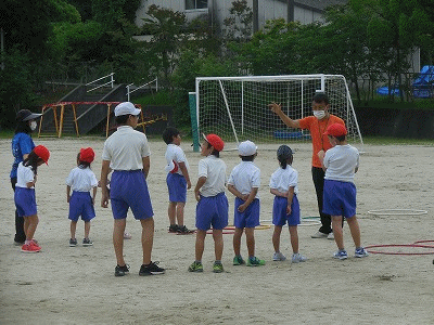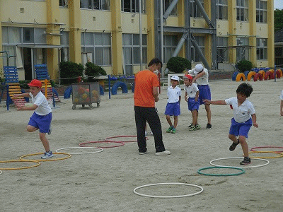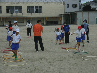 タンバリンのリズムに合わせて、地面に置いたフラフープを使って上手にケン・ケン・パができました。両方の足でケン・ケンすると、いい準備運動になります。
