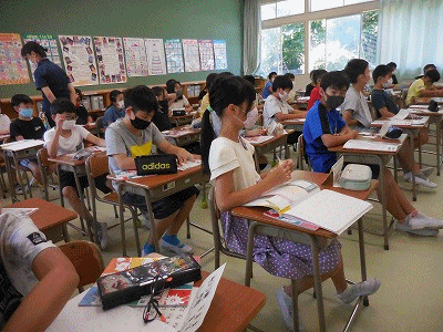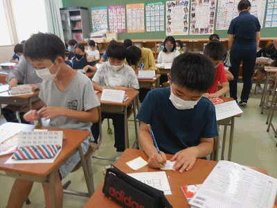 ジェレット先生の授業です。名刺交換ゲームのために、2枚の紙に自分の名前をローマ字で書きます。その下に、自分の好きなスポーツの絵を描きました。次の時間に「What sports do you like ?」「I like 〜.」と会話して名刺交換します。