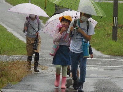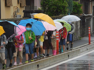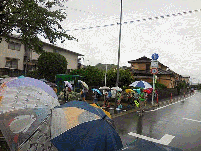 久しぶりの雨の朝で、少し肌寒く感じられます。みんなが傘をさしているので、通学班が長く伸びています。横断歩道から階段までがとても混雑しました。